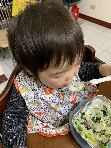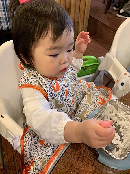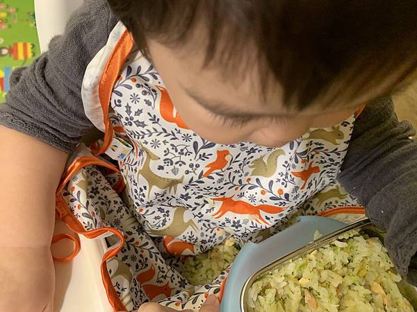 但這個圍兜 太花 他完全不知道 圍兜裡面有飯~~~~~~